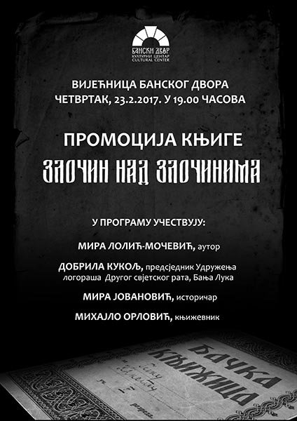 У Вијећници Банског двора 23. фебруара 2017. године (четвртак) у 19,00 часова биће промовисана књига „Злочин над злочинима“, аутора Мире Лолић Мочевић,