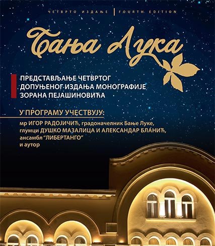 У Концертној дворани Банског двора 14. децембра 2016. године (сриједа) у 20,00 часова одржаће се промоција монографије „Бања Лука“, аутора Зорана Пејашиновића,