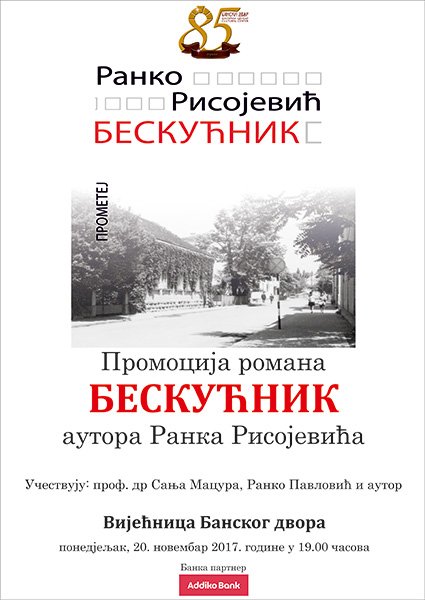 У Вијећници Банског двора 20. новембра 2017. године (понедјељак) у 19.00 часова биће промовисан роман БЕСКУЋНИК, аутора Ранка Рисојевића.