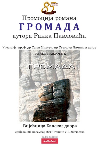 У Вијећници Банског двора 22. новембра 2017. године (сриједа) у 19.00 часова биће промовисан роман ГРОМАДА, аутора Ранка Павловића.