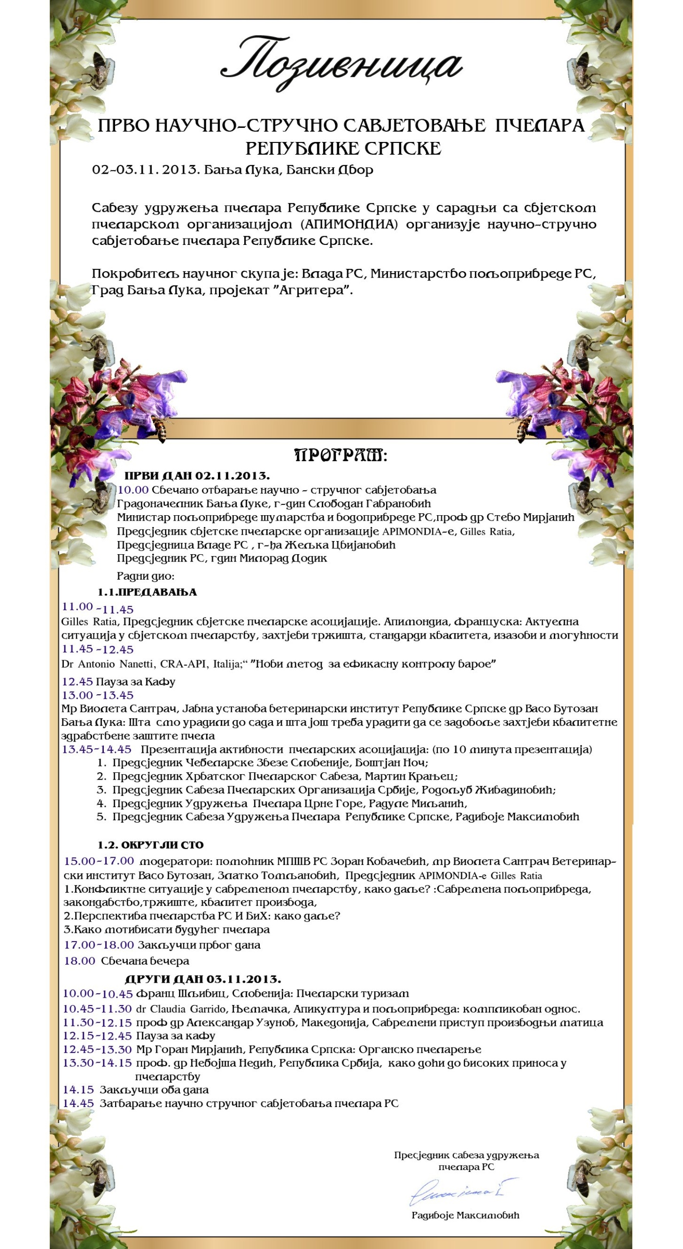 У Концертној дворани Банског двора 02. и 03. новембра 2013. године (субота и недјеља) од 09,00 часова одржаће се Прво научно-стручно савјетовање пчелара Републике Српске.