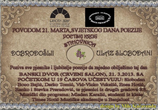 У Црвеном салону Банског двора 21. марта 2013. године (четвртак) у 19,00 часова одржаће се Свјетски дан поезије – „Стиховница“.