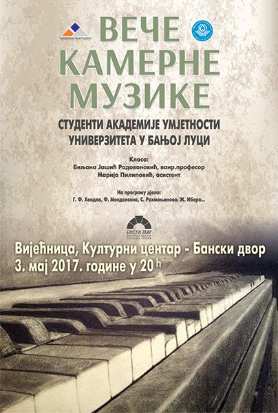 У Вијећници Банског двора 03. маја 2017. године (сриједа) у 20,00 часова одржаће се Вече камерне музике,