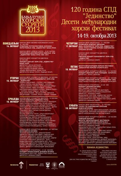 У ПЕРИОДУ ОД 14. ДО 19. ОКТОБРА 2013. ГОДИНЕ ОДРЖАЋЕ СЕ ЦЕНТРАЛНИ ДИО ОБИЉЕЖАВАЊА МАНИФЕСТАЦИЈЕ ЈУБИЛЕЈА, А У СКЛОПУ ОБИЉЕЖАВАЊА НАСТАВИЋЕ СЕ ДЕСЕТИ МЕЂУНАРОДНИ ХОРСКИ ФЕСТИВАЛ.