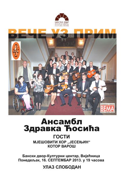 У Вијећници Банског двора 16. септембра 2013. године (понедјељак) у 19,00 часова одржаће се концерт Ансамбла Здравка Ћосића „Вече уз прим“.