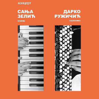 У Арт дворишту Банског двора 22.августа (уторак) 2023. године у 21.00 час одржаће концерт DUO ACCORDIANO / ДУО АКОРДИАНО САЊА ЗЕЛИЋ (клавир) & ДАРКО РУЖИЧИЋ (хармоника).