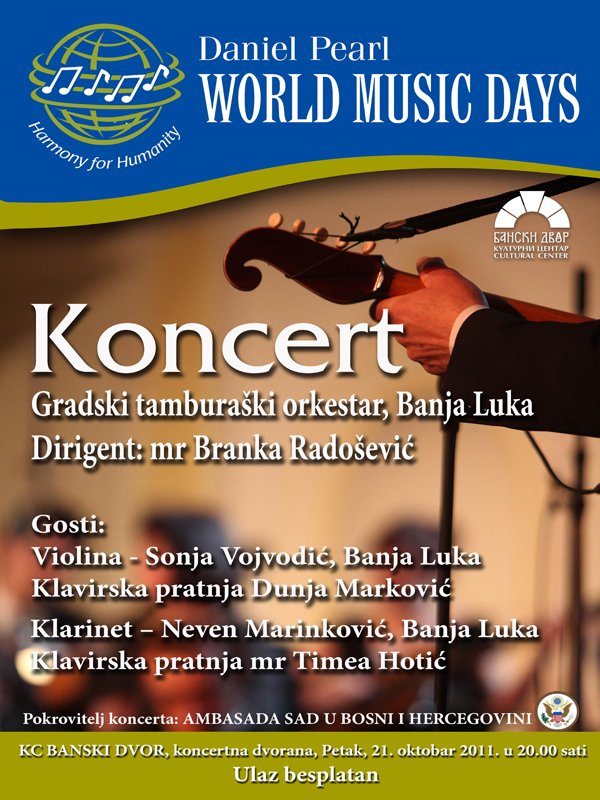 У концертној дворани Банског двора 21. октобра са почетком у 20,00 часова одржаће се концерт Градског тамбурашког оркестра , Бања Лука под називом „ХАРМОНИЈОМ ЗА ХУМАНОСТ“.