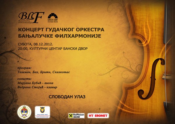 Концерт Гудачког оркестра Бањалучке филхармоније АРХИВА27/10/2012 У Концертној дворани Банског двора 08. децембра 2012. године (субота) у 20,00 часова одржаће се концерт Гудачког оркестра Бањалучке филхармоније. Програм: Телеман, Бах, Бритн, Скалкотас Солисти: Мирјана Бубић – виола Ведрана Стојић – клавир