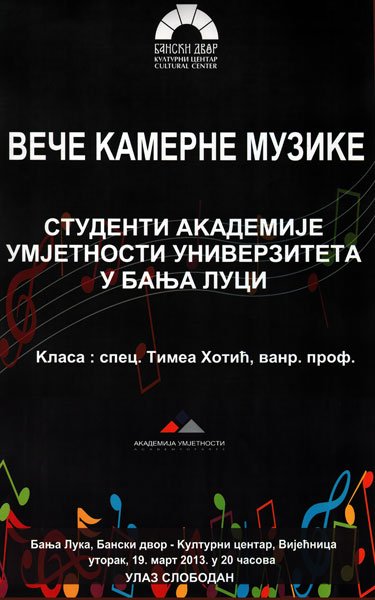 У Вијећници Банског двора 19. марта 2013. године (уторак) у 20,00 часова одржаће се концерт камерне музике у извођењу студената Академије умјетности Универзитета у Бањој Луци, класа: спец. Тимеа Хотић, ванредни професор.