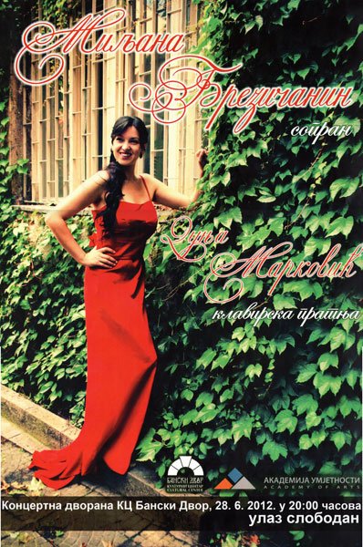 У Концертној дворани Банског двора 28.06.2012. године (четвртак) у 20,00 часова одржаће се концерт Миљане Брезичанин, сопран.