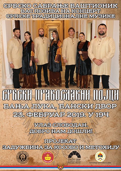 У Концертној дворани Банског двора 23. фебруара 2019. године (субота) у 19.00 часова одржаће се концерт Србски Православни Појци.