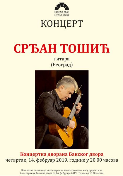 У Концертној дворани Банског двора 15. фебруара 2019. године (петак) у 20.00 часова одржаће се концерт Срђан Тошић – гитара (Београд).