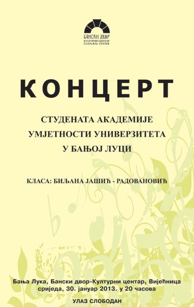 У Вијећници Банског двора 30. јануара 2013. године (сриједа) у 20,00 часова одржаће се концерт под називом „Вече камерне музике“ у извођењу студената Aкадемије умјетности универзитета у Бањој Луци, катедре за камерну музику а у класи Биљане Јашић – Радовановић.