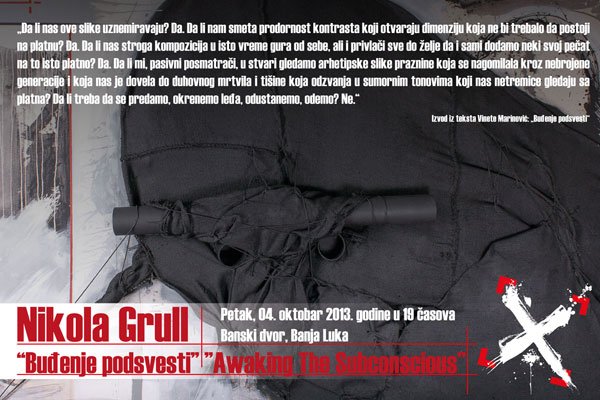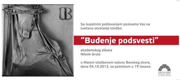 У Малом изложбеном салону Банског двора 04. октобра 2013. године (петак) у 19,00 часова одржаће се отварање изложбе слика и објеката Николе Груловића „Буђење подсвести“.