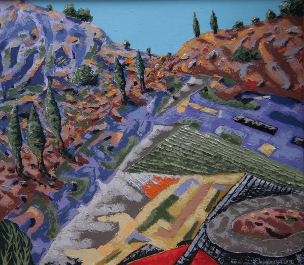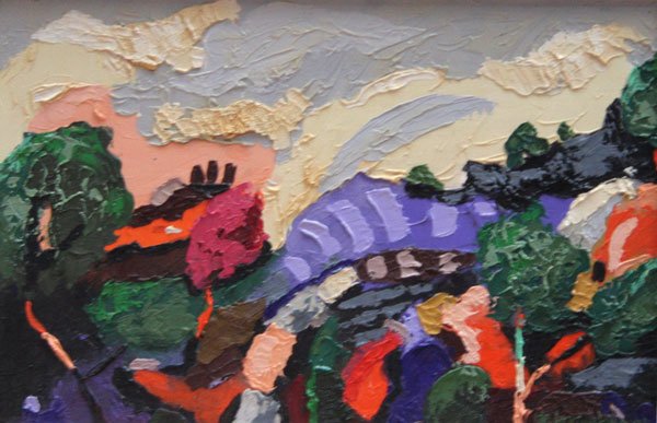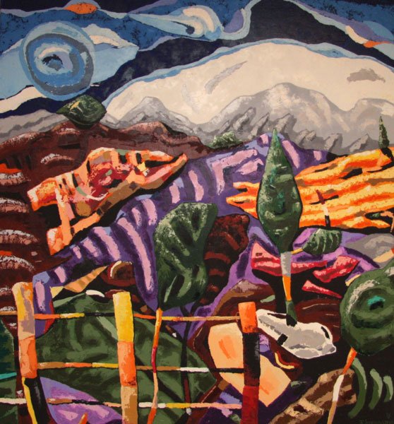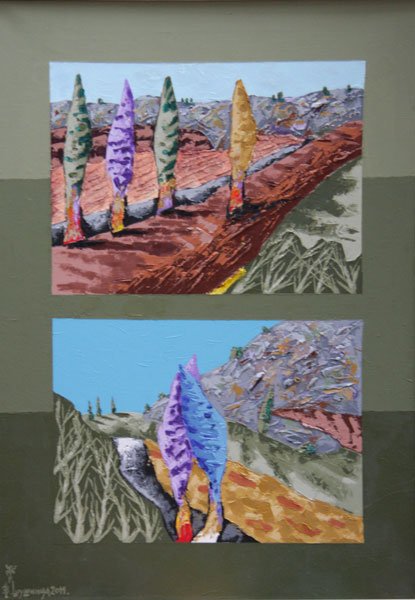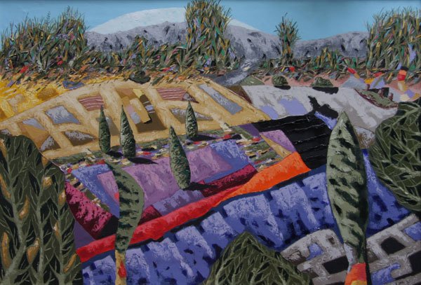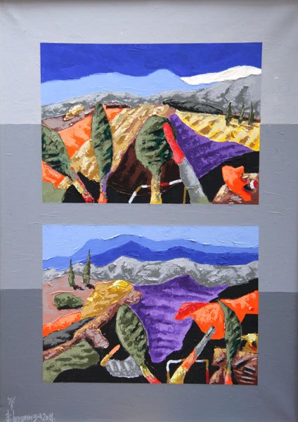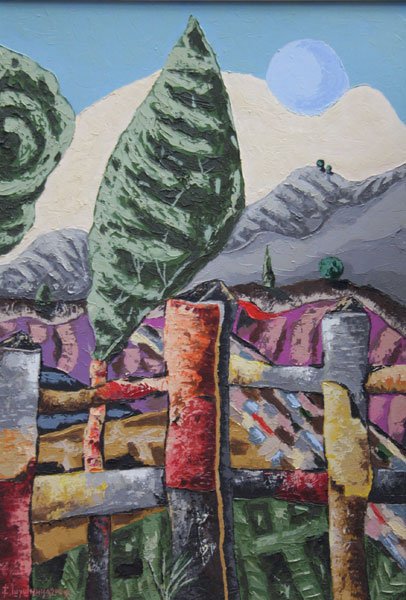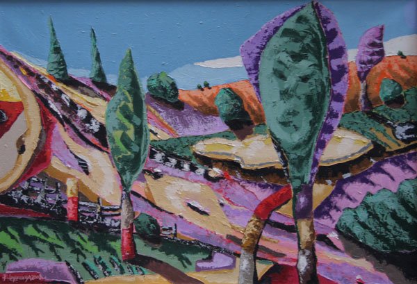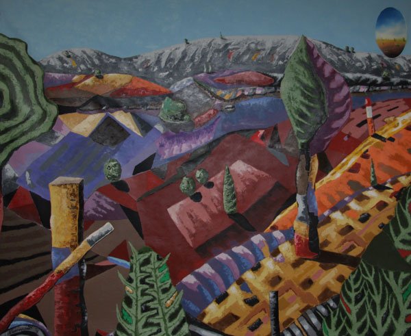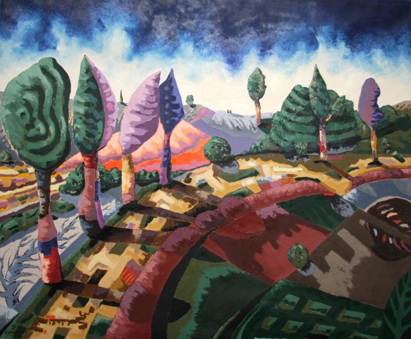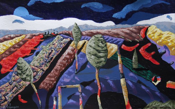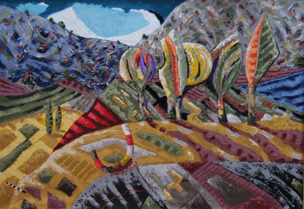 Пејзаж је као ћилим живих боја прострт на површину, коју просторно назначују дрволика израстања, од већег ка мањем.