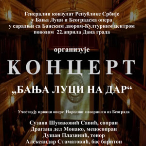 У Концертној дворани Банског двора 23. априла 2013. године (уторак) у 20,00 часова одржаће се концерт под називом „БАЊА ЛУЦИ НА ДАР“ који организује Генерални конзулат Републике Србије у Бања Луци и Београдска опера у сарадњи са Банским двором – …… Pročitaj više →