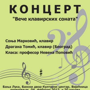 У Концертној дворани Банског двора 11. фебруара 2013. године (понедјељак) у 20,00 часова одржаће се концерт Биљане Керкез – сопран. Клавирска сарадња: Арсен Чаркић Гости: Албина Смајловић, сопран, Александар Драгојевић, баритон *** Program: 1.Benedetto Giacomo Marcello: „Il mio belfoco“ 2.Wolfgang …… Pročitaj više →