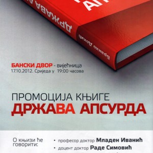 У Вијећници Банског двора 17. октобра 2012. године (сриједа) у 19,00 часова одржаће се промоција књиге „Држава апсурда“ проф. др Бранка Докића. О књизи ће говорити: професор доктор Младен Иванић, доцент доктор Раде Симовић, Слободан Наградић, предсједник Српског демоктратског форума, Радован …… Pročitaj više →