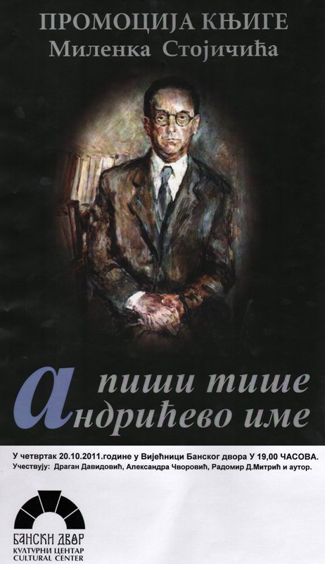 „Пиши тише Андрићево име“ АРХИВА12/10/2011 У Вијећници културног центра Банског двора 20.10.2011.године у 19,00 часова одржаће се промоција романа Миленка Стојчића “ Пиши тише Андрићево име“ Учествују: Драган Давидовић, Александра Чворовић, Радомир Д.Митрић и аутор.