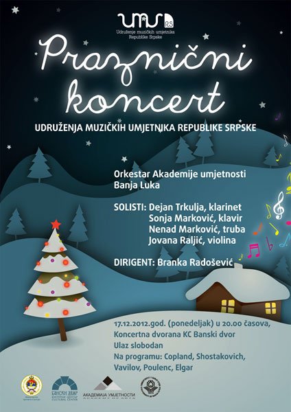 У Концертној дворани Банског двора 17. децембра 2012. године (понедјељак) у 20,00 часова одржаће се празнични концерт Удружења музичких умјетника Републике Српске.