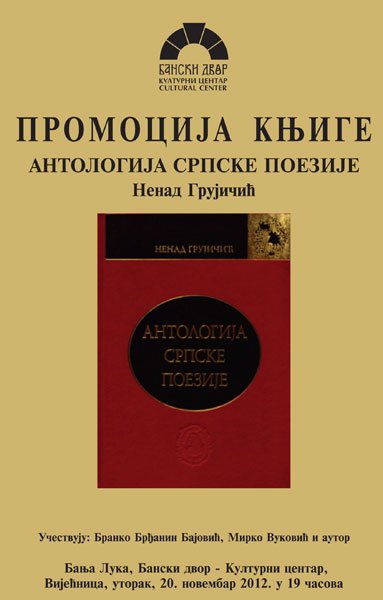 У Вијећници Банског двора 20. новембра 2012. године (уторак) у 19,00 часова одржаће се промоција књиге „Антологија српске поезије“ приређивача Ненада Грујичића.