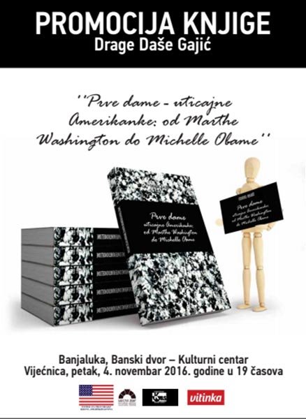 У Вијећници Банског двора 04. новембра 2016. године (петак) у 19,00 часова биће промовисана књига „Прве даме – утицајне Американке од Marte Washington do Michelle Obame“, аутора Драге Гајић,