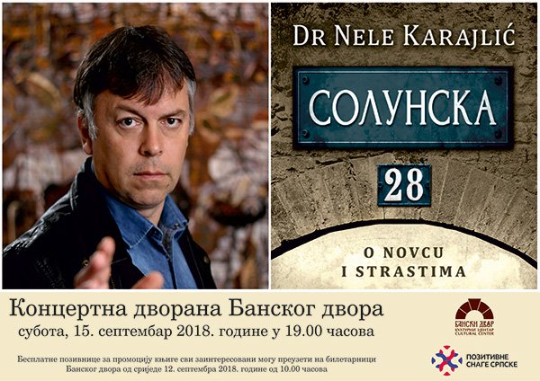 У Концертној дворани Банског двора 15. септембра 2018. године (субота) у 19.00 часова биће промовисана књига „Солунска 28“, аутора Нелета Карајлића.