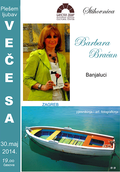 У Вијећници Банског двора 30. маја 2014. године (петак) у 19,00 часова одржаће се промоција збирке пјесама “Плешем љубав“ аутора Барбаре Брачун (Загреб) и изложба фотографија под називом „Море љубави“.