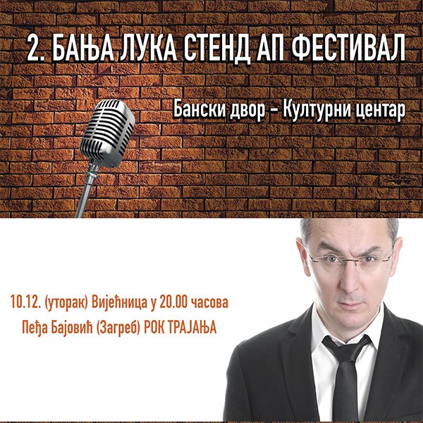 У Вијећници Банског двора 10. децембра 2019. године (уторак) у 20.00 часова у оквиру 2. БАЊА ЛУКА СТЕНД АП ФЕСТИВАЛА биће изведена представа РОК ТРАЈАЊА стенд уп комичара из Загреба, ПЕЂЕ БАЈОВИЋА. Трећа соло представа Пеђе Бајовића, говори о феномену старења и даје одговоре на нека важна питања. Улазнице за представу могу се купити од 03. децембра на билетарници Банског двора у периоду од 10.00 до 18.00 часова, по цијени од 5КМ.