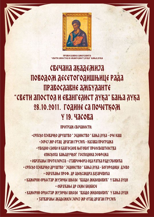 У Вијећници Банског двора Бања Лука, дана 28. октобра 2011. године (петак) са почетком у 19,00 часова, одржаће се СВЕЧАНА АКАДЕМИЈА ПОВОДОМ ДЕСЕТОГОДИШЊИЦЕ РАДА ПРАВОСЛАВНЕ АМБУЛАНТЕ „СВЕТИ АПОСТОЛ И ЕВАНГЕЛИСТ ЛУКА“ БАЊА ЛУКА.