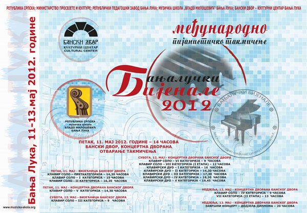 У Концертној дворани и Вијећници Банског двора 11, 12. и 13. 05. 2012. године од 09,00 часова одржаће се Треће међународно пијанистичко такмичење „БАЊАЛУЧКИ БИЈЕНАЛЕ 2012“.